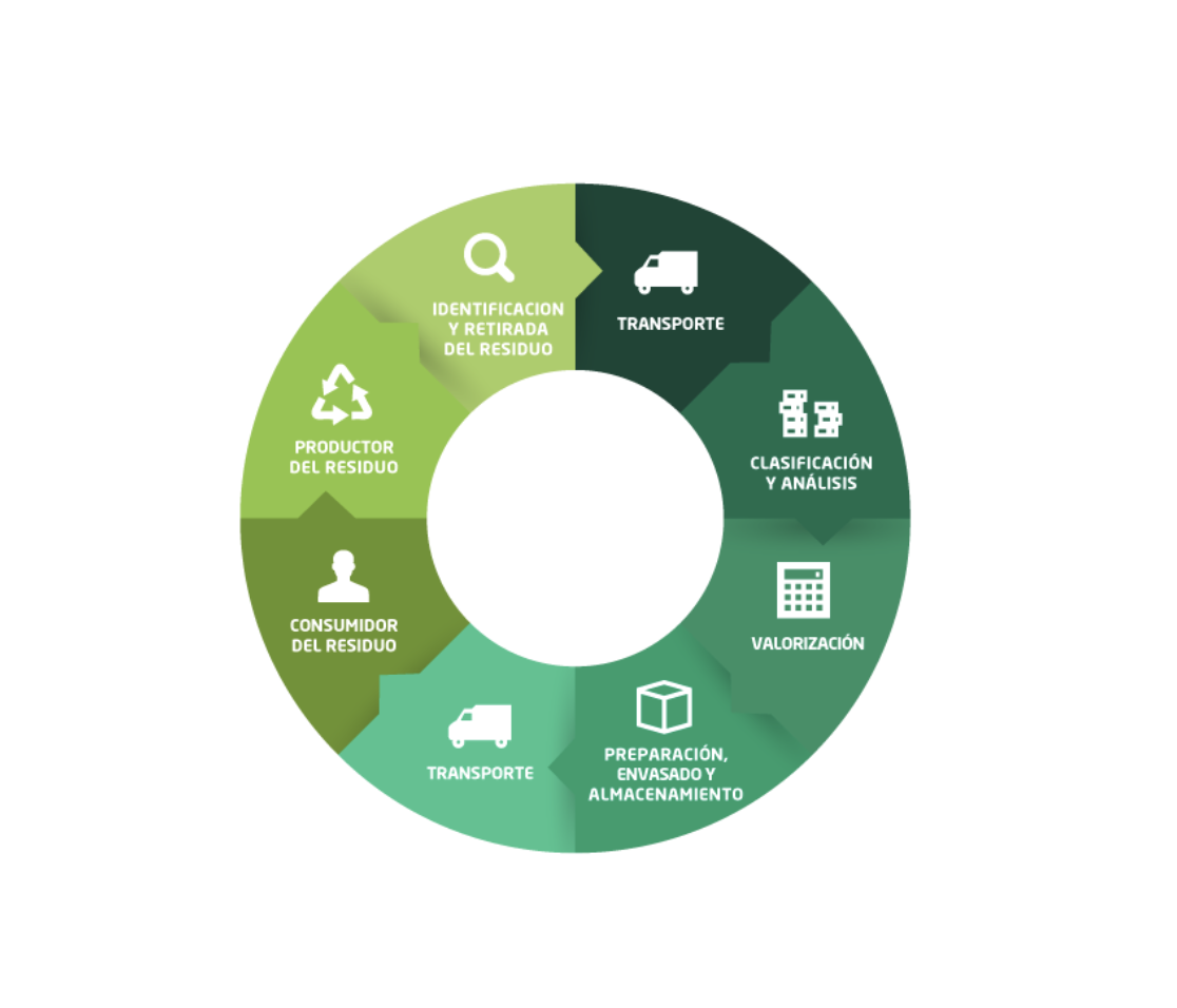 La cadena de reciclaje incluye una serie de etapas en ubicaciones diferentes. Tras la separación de los residuos por contenedores en los ámbitos doméstico e industrial, se llevan a cabo estas etapas: